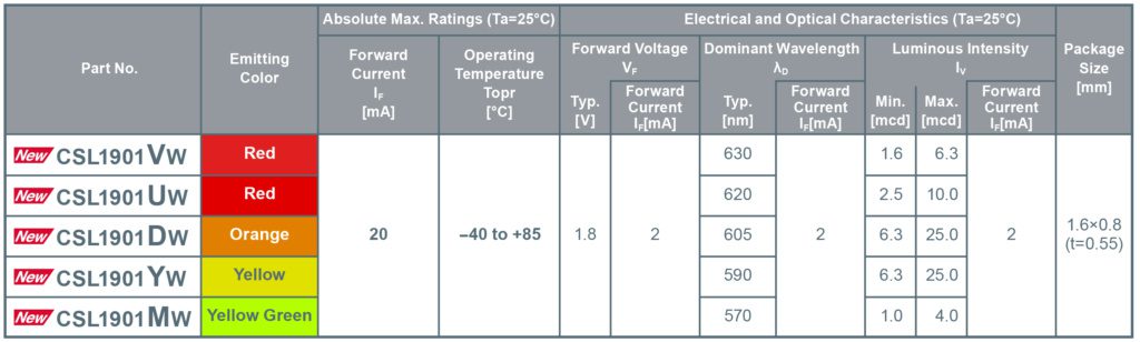 Using standard LEDs that operate at 20mA, the low current results in brightness and colour differences that vary from part to part. Compared to existing products at 2mA, the new LEDs reduce brightness variations by half and colour sifting by 3nm, minimizing design man-hours required for light emission while improving visibility in indicators and numeric displays.