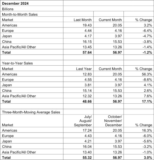 It is the Americas region that has been carrying this growth. The SIA reported a three-month average figure of US$20.05 billion in December, which can also be read as US$60.15 billion in 4Q24, up 56.3 percent on the same 3MMA in December and 4Q23.
