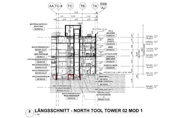 Elevation showing detail of tower where EUV lithography equipment can be introduced. Source: Download of Intel plans.