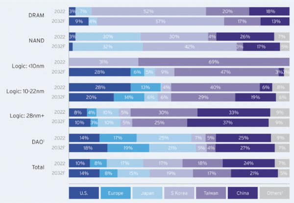 Global fab capacity by region and technology category 2022 and 2032F. Source: SIA, Boston Consulting Group.