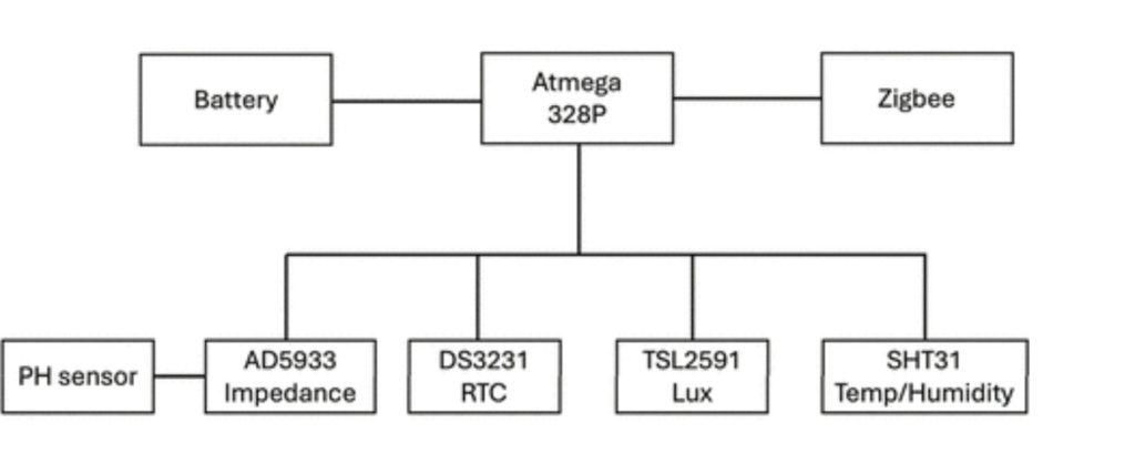 The module is based around the including the ATmega644PA microcontroller (MCU) and several integrated sensors: the SHT31 for temperature and humidity, the TSL2591 for light levels, the AD5933 for impedance measurements and the DS3231 real-time clock (RTC). The RTC ensures accurate timing for synchronized data collection through its temperature-compensated crystal oscillator.