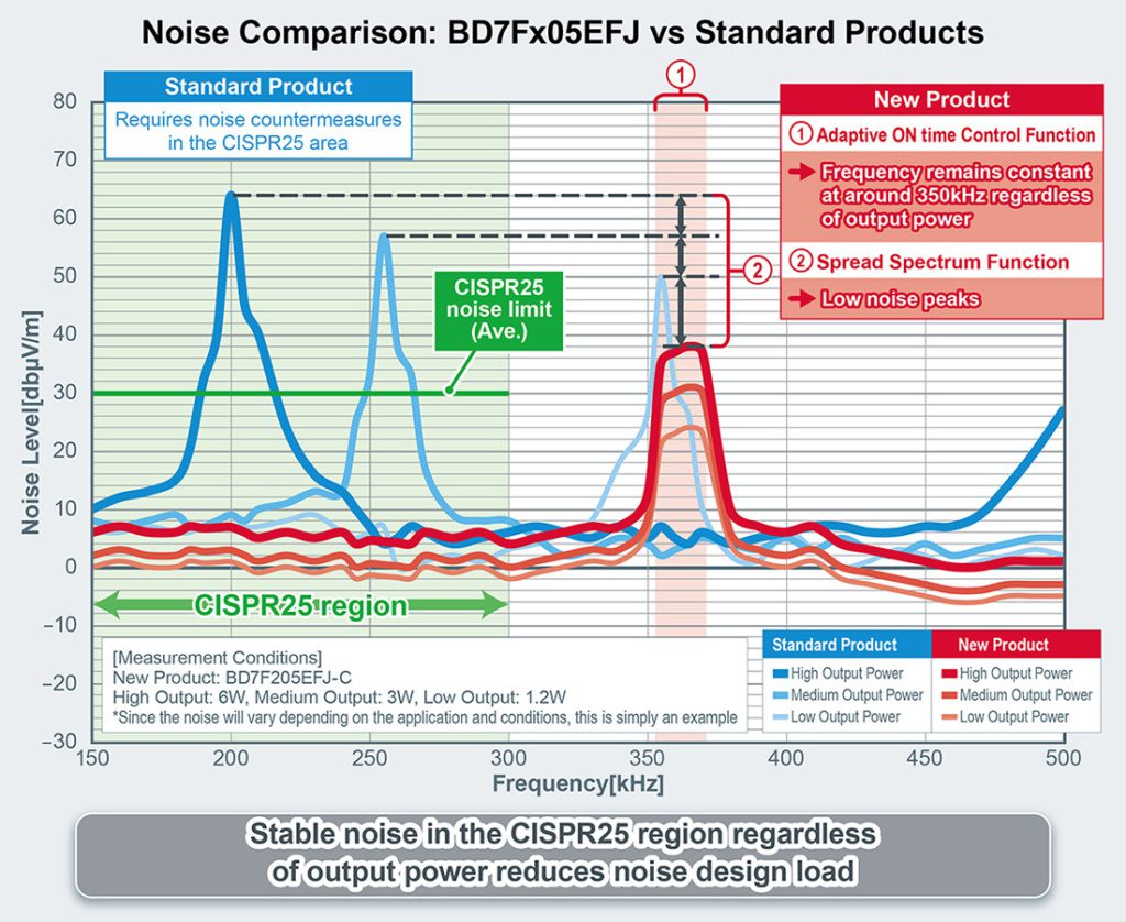 The BD7Fx05EFJ-C DC-DC converter is also equipped with an adaptive ON-time control function that fixes the switching ON time, ensuring a stable frequency of around 350 kHz regardless of output power. To be compliant with the CISPR25 automotive EMC standard requires considerable noise design in the frequency range from 150 kHz to 300 kHz, but as theses new converters do not fall within this band, noise countermeasures can be greatly simplified. This, together with a spread spectrum function that minimizes radiated noise, contributes to reducing the number of efforts for noise design.