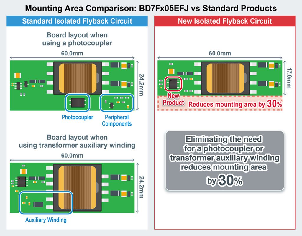 The BD7F105EFJ-C, BD7F205EFJ-C converters use a circuit configuration that achieves stable switching frequency characteristics without requiring a photocoupler, decreasing application size together with workload for noise design countermeasure. Leveraging superior analog design technology allows the BD7Fx05EFJ-C DC-DC converter to eliminate the need for photocouplers, transformer auxiliary windings, and peripheral components conventionally necessary to detect secondary-side voltage and current. On top, next to solving issues with photocouplers, such as large power consumption, fluctuating detection accuracy due to temperature, and deterioration over time, ROHM has also achieved greater miniaturization by reducing the number of components. As a result, it is possible to reduce the number of components — including the photocoupler — used for current detection by 10 (equivalent to a board area of 30%) compared to general isolated flyback power supply circuits