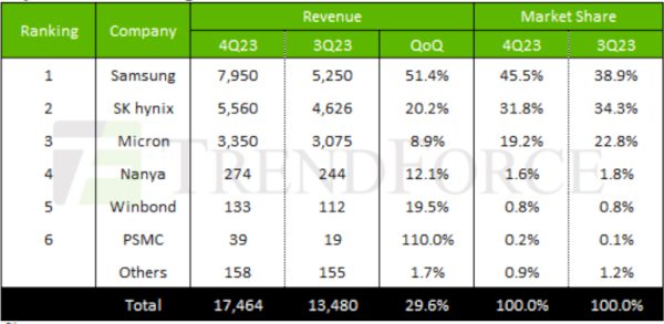 DRAM makers ranked by 4Q23 revenue. Source: TrendForce.