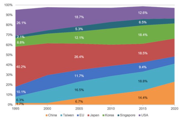 World wafer fab capcity market share by country/region from 1995 to 2020. Source: ESIA