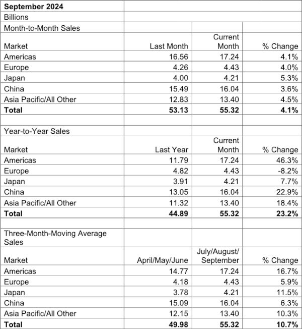 Three-month average of chip sales by geographic region for September and August 2024. Source: SIA/WSTS.