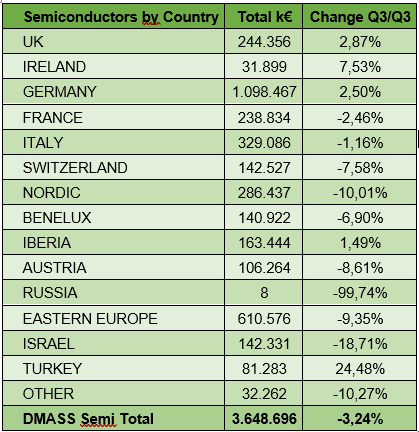 Semiconductors showed a slight decline of 3.2%. Only the UK, Germany and Turkey saw growth while the rest slid into slowdown. From a product perspective, most product groups showed negative growth, except for MOS Micro, Programmable Logic and Other Logic.