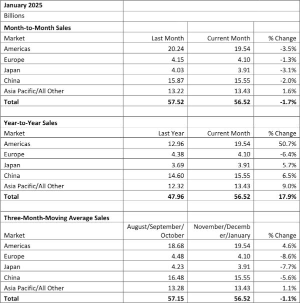 Three-month average of chip sales by geographic region for January 2025 and December 2024. Source: SIA/WSTS.