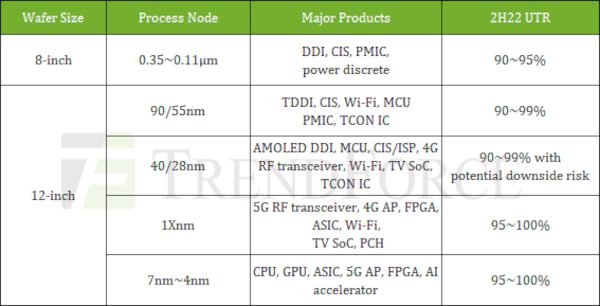 Foundry manufacturing capacity utilizations rates for 2H22. Source: TrendForce.