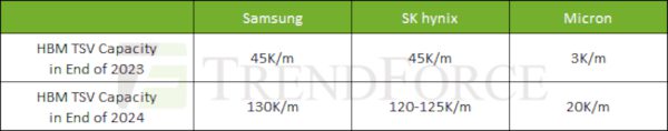 Estimated HBM/TSV manufacturing capacity by supplier 2023, 2024. Source: TrendForce.
