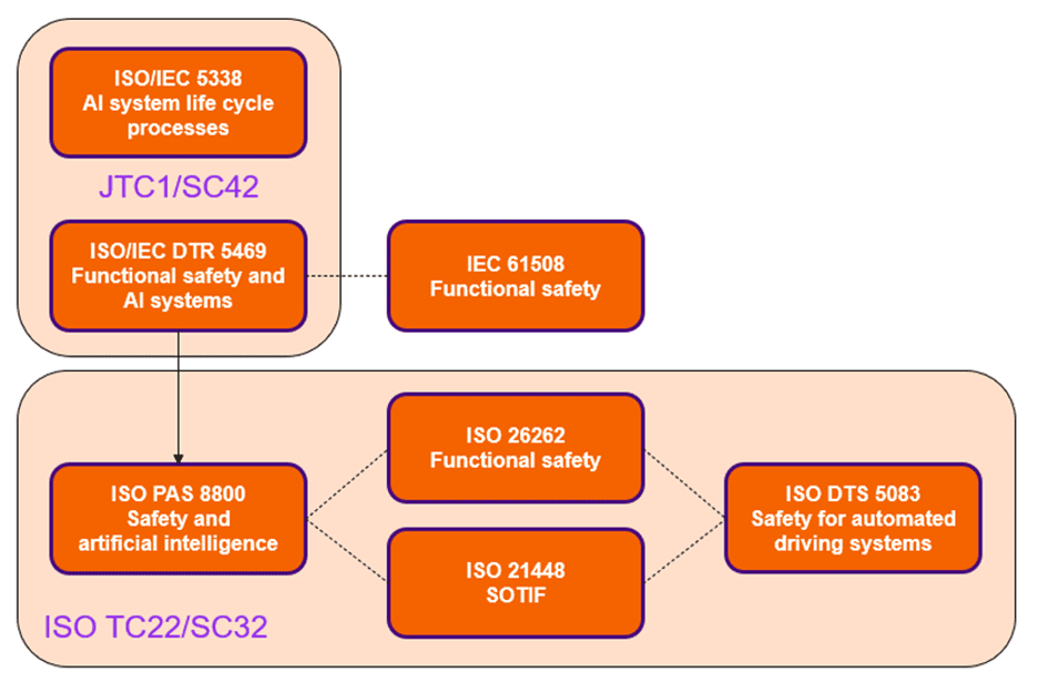 - ISO/CD PAS 8800, Road Vehicles – Safety and artificial intelligence: This document will define safety-related properties and risk factors impacting any insufficient performance and malfunctioning behavior of AI. It includes deriving safety requirements, considerations of data quality and completeness, and architectural measures for the control and mitigation of failures.