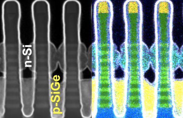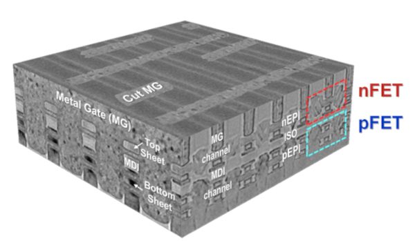 An inline cross-section transmission electron microphotograph shows a monolithic CFET with a gate pitch of 48nm and with nFETs placed above pFETs, and both types of transistors surrounded by a single metal gate.