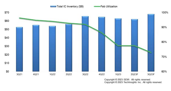 Total IC inventory in the global chip sector is expected to climb and IC manufacturing capacity utilization is expected to fall in 3Q23, according to industry body SEMI.