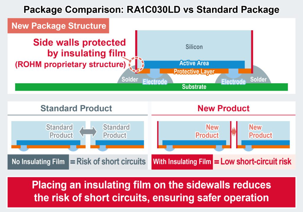 The RA1C030LD is offered in the DSN1006-3 wafer-level, chip-size package that measures 1.0mm × 0.6mm. This is made possible by a proprietary IC process to achieve low power dissipation together with greater miniaturization and a new packaging technique.