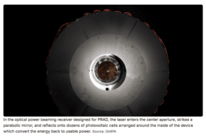 DARPA recently tested the Persistent Optical Wireless Energy Relay (POWER) program and achieved a new record, more than 800 waste during a 30 seconds transmission over a distance of 8.6 kilometres. The receiver (designed by Teravec Technologies) uses a centre aperture for the laser beam to enter. A parabolic mirror reflects the laser onto a dozen photovoltaic cells that convert the energy back to usable power. Usable means that the team used the energy to make some nice popcorn.
