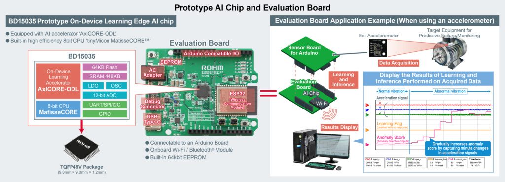 This AxlCORE-ODL block has been combined with Rohm’s high-efficiency 8-bit CPU tinyMicon MatisseCORE IP to enables both AI learning and inference for predictive maintenance of motors and sensors in real-time.