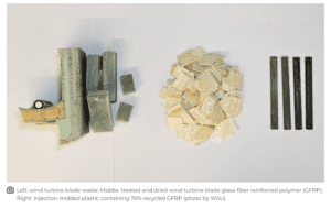 A new method to recycle wind turbine blades without using harsh chemicals resulted in the recovery of high-strength glass fibers and resins that allowed Washington State University researchers to re-purpose the materials to create stronger plastics.