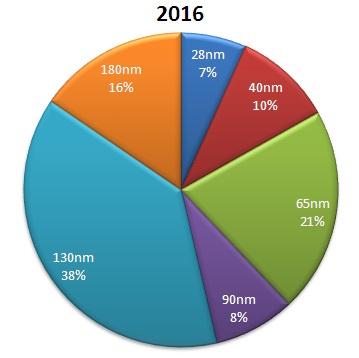 A 2016 forecast from Anysilicon on semiconductor technology nodes is illustrated in the following pie chart.