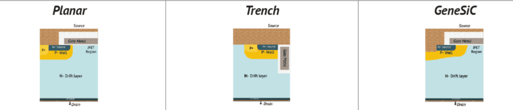 The GeneSiC technology is a ‘trench-assisted planar-gate’ structure where the gate is on the surface on top of a trench diode.