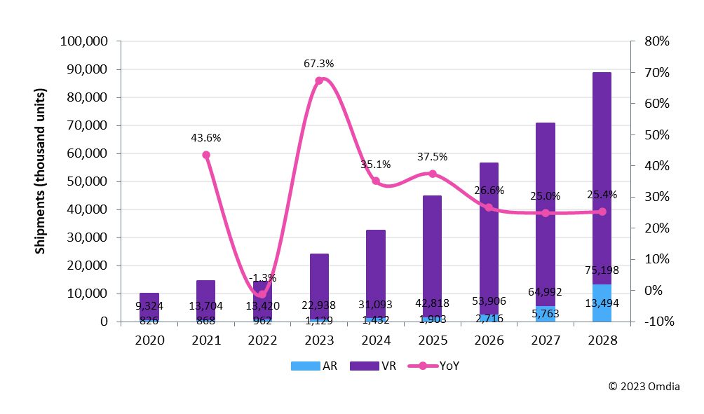 Figure 1: Near-eye display shipments forecast and growth in AR/VR applications, 2020–28. Source: Omdia.