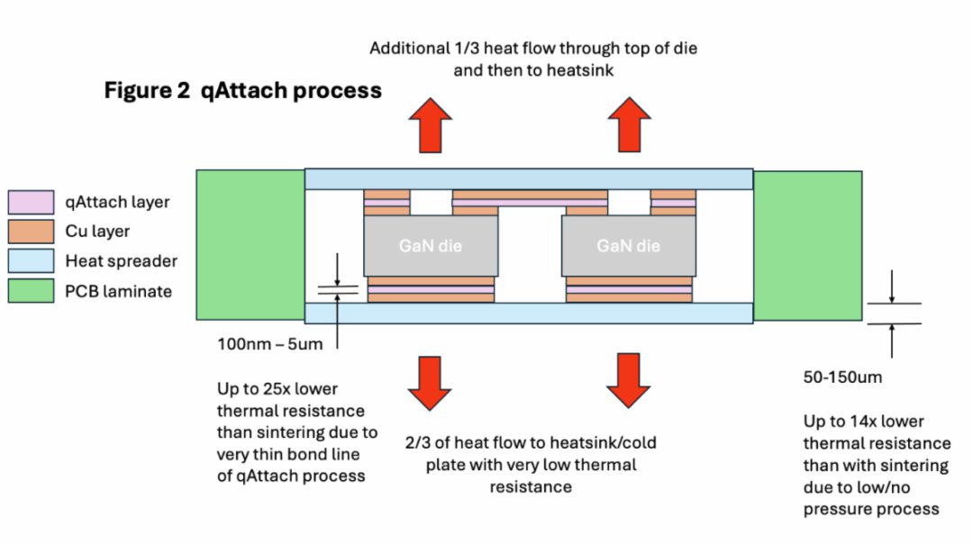 Further qAttach offers other improvements over the current sintering process. Firstly, the substrate can be much thinner as the application of the large force needed by sintering is not required. The thinner substrate significantly reduces thermal resistance to further help heat transfer away to the heat sink.