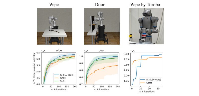 Subsequently, the impedance gain is explored through Bayesian optimization using prior knowledge. Since IC-SLD also outputs an estimated value of the impedance gain, using this as a solution candidate makes optimization more efficient. By applying Bayesian optimization π-BO [Hvarfner+, ICLR2022] that is able to make use of prior knowledge, optimal impedance gains that simultaneously optimize task performance (the cumulative sum of reward functions) and safety indices (the cumulative sum of stiffness parameters) are searched while repeating robot motion trials.