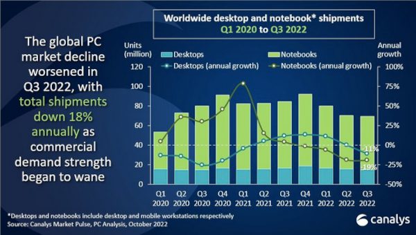 Worldwide desktop and notebook computer shipments 1Q20 to 3Q22. Source: Canalys.
