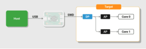 A debug probe provides a bridge between USB and the SWD protocol, allowing a host to access the target’s debug port