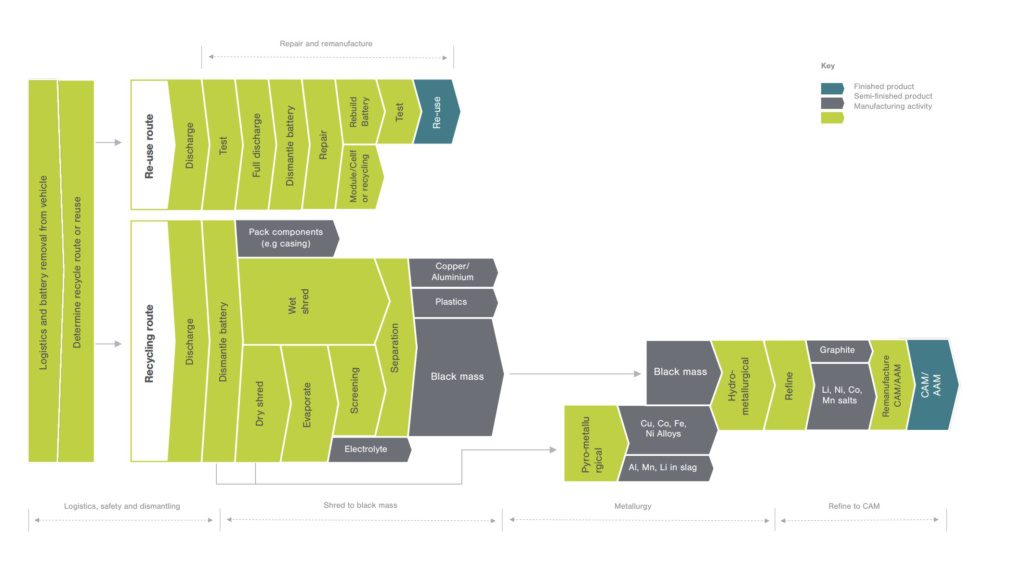 The report examines the current landscape including existing capabilities, risks and opportunities across the battery end of life recycling value chain and illustrates the path of reuse and recycling, highlighting which materials can be recovered and at which point in their lifecycle.