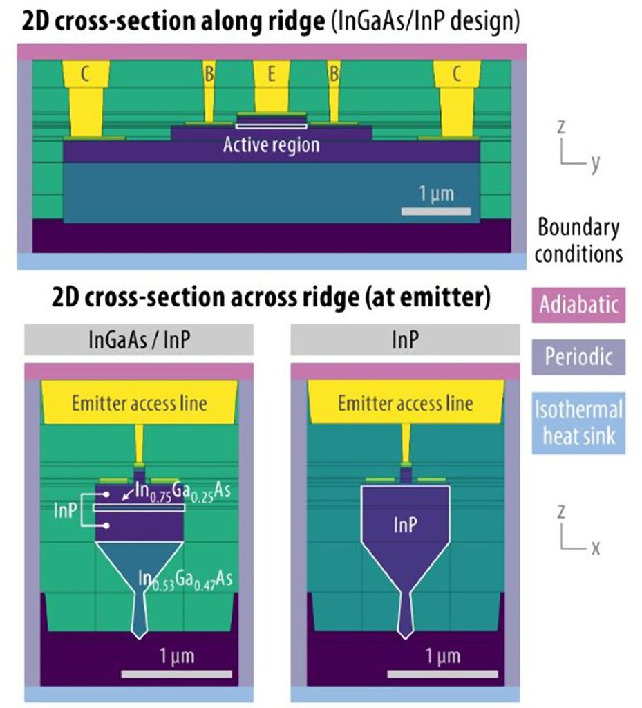 “While the tapered ridge bottoms enable low defect density within the III-V materials, they, however, induce a thermal bottleneck for heat removal towards the substrate,” explains Bjorn Vermeersch, principal member of technical staff in the thermal modeling and characterization team at imec. “Our 3D Monte Carlo simulations of NRE InP HBTs indicate that the ridge topology raises the thermal resistance by over 20 percent compared to a hypothetical monolithic mesa of the same height. Our analyses furthermore highlight the direct impact of the ridge material (e.g., InP versus InGaAs) on self-heating, providing an additional knob to improve the designs thermally.”