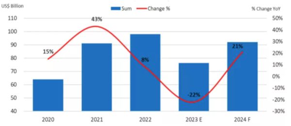 Overall the global fab equipment spending for front-end facilities is expected to decrease 22 percent year-over-year (YoY) to US$76 billion in 2023 before rising 21 percent YoY to US$92 billion in 2024.