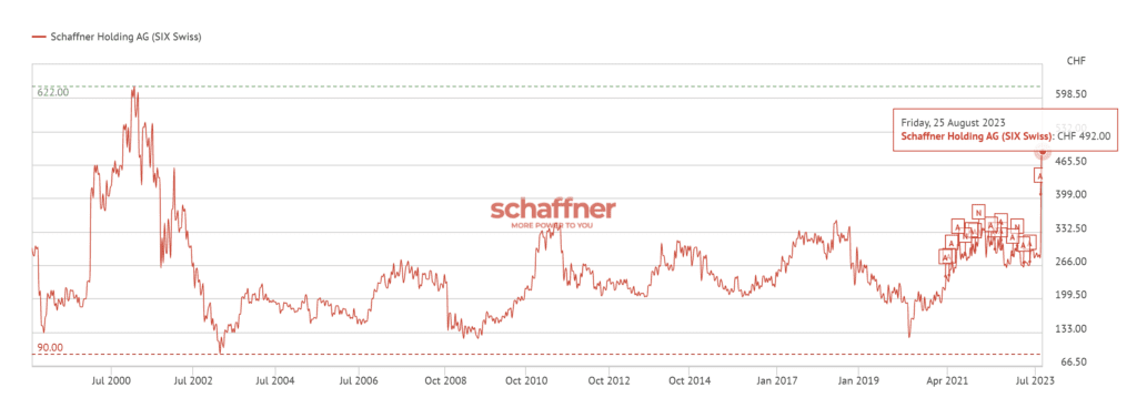 Schaffner is a leading developer of filters for electromagnetic compatibility (EMC) in large equipment, heat pumps and automotive. It reported net sales of CHF 84.8 million for the first half of 2022/23, an increase of 7.4% compared with the same period of the previous year at CHF 78.9 million. However the offer of CHF505 is below the peak value of CHF622 in mid 2000.