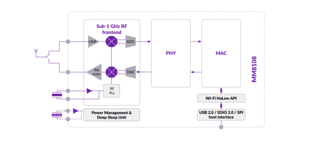 A USB reference design, the MM8108-RD09 USB, demonstrates the ease of upgrading new and existing Wi-Fi 4/5/6/6E/7 network infrastructure to support Wi-Fi HaLow. The dongle reference design will be made available to customers as a fully compliant Wi-Fi HaLow reference design, which can be used to build commercial USB dongles or to simplify the integration of the MM8108 silicon in end products, along with a surface mount antenna selected for optimal performance.