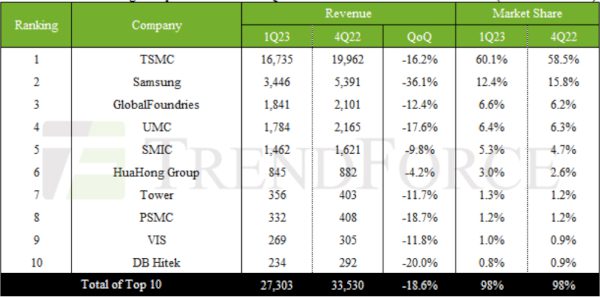 The top ten foundries in the world – responsible for about 98 percent of sales – saw revenue decline by 18.6 percent compared with 4Q22, according to TrendForce.
