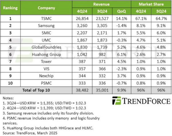 TSMC raised its share of the global pure-play foundry market to 67.1 percent in the 4Q24, in a market that climbed sequentially by 14.1 percent, according to TrendForce.