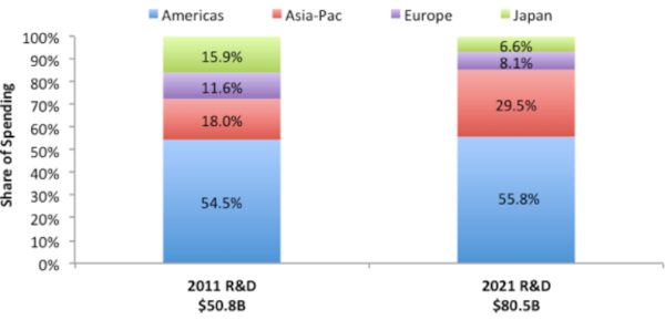 Semiconductor R&D spending by HQ location 2011 and 2021. Source: IC Insights.
