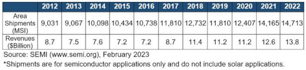 Annual wafer shipments, revenues 2012 to 2022. Source: SEMI.
