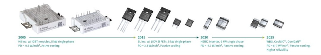 Eventually, advancements in MOSFET devices allowed an alternative option for solar inverter applications. Devices such as OptiMOS N-channel power MOSFETs offer high efficiency and power density at a competitive price. More recently, wide bandgap (WBG) devices are offering competitive advantages making them more attractive for current and future solar inverter applications. WBG technologies such as silicon carbide (SiC) have shown to offer significantly improved power conversion efficiency which helps saves energy while also reducing the size and weight of inverter devices. The size and weight of a system is important to keep in mind since it can ease the burdens of installation and maintenance. The evolution of transistor devices in solar inverter applications is best displayed below.