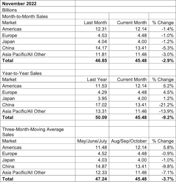 Three-month average of chip sales by geographic region for November and October 2022. Source: SIA/WSTS.