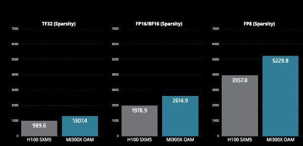 Dans sa documentation, AMD a fait des déclarations audacieuses sur la capacité du MI300x à surpasser la H100 de Nvidia. AMD revendique un avantage de 32 % en termes de performances pour le MI300x par rapport au H100 de Nvidia pour les types de données TensorFloat, à virgule flottante, block-float et entiers, comparés au H100. Le H100 ne dispose que de 80 Go de mémoire HBM3 contre 192 Go pour le MI300X.