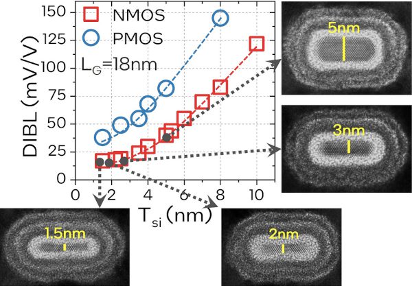 Abaissement de la barrière induit par le drain (DIBL) en fonction de l’épaisseur de silicium (Tsi) à une longueur de grille de 18 nm. On observe une réduction lorsque Tsi passe de 10 nm à 1,5 nm ; toutefois, la réduction de DIBL est saturée à Tsi <4 nm. La DIBL du PMOS est plus élevée que celle du NMOS à la même Tsi. Vous trouverez également des micrographies TEM d’un transistor 1NR avec différentes valeurs de Tsi jusqu’à 1,5nm. Source : IEDM : IEDM.