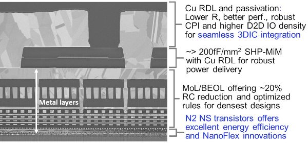 Coupe transversale d’une pile d’interconnexion N2 montrant la couche de redistribution du cuivre. Source : IEDM et T l’image en coupe montre que la couche de redistribution du cuivre (RDL) et la passivation de la plate-forme N2 permettent une intégration transparente avec les technologies 3D.