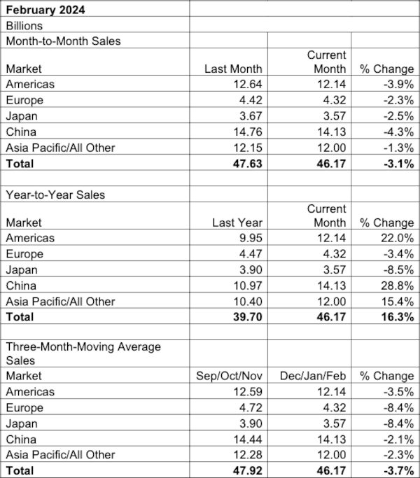 Moyenne sur trois mois des ventes de puces par région géographique pour février et janvier 2024. Source : SIA/WSTS SIA/WSTS