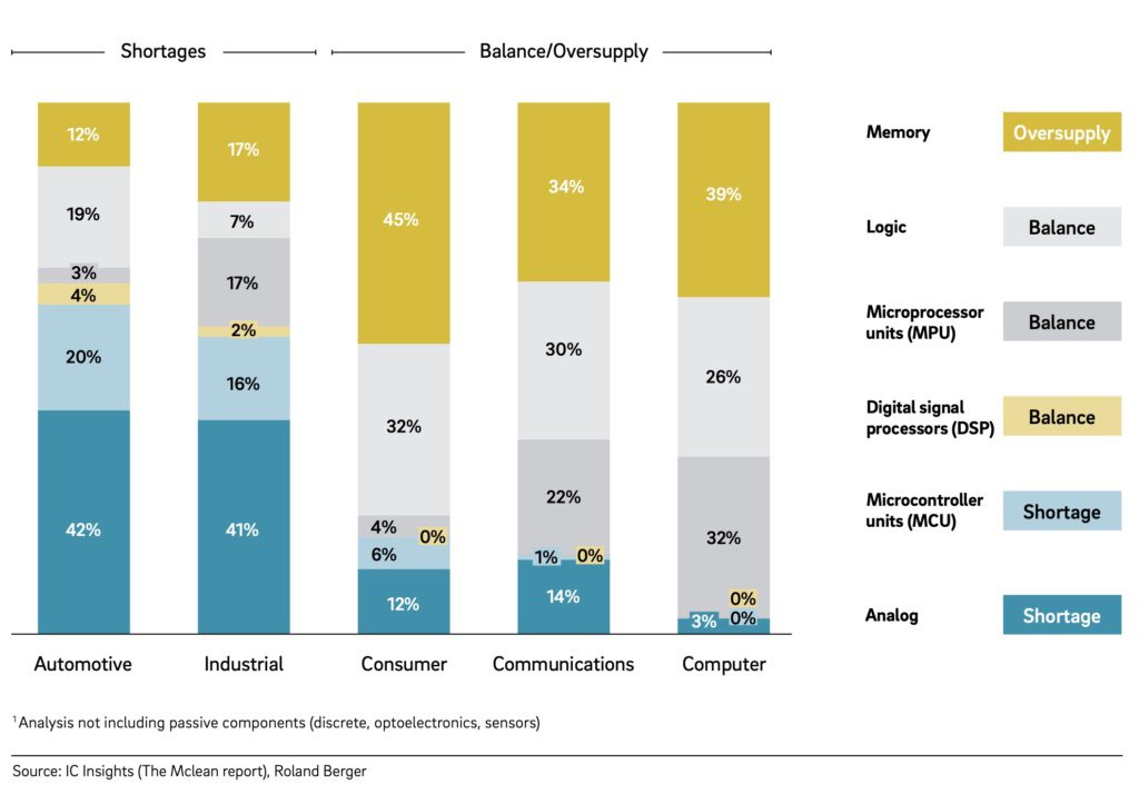 Il existe actuellement une offre excédentaire sur le marché pour près de la moitié des puces nécessaires à l’électronique grand public, pour près de 40 % dans les ordinateurs et 34 % dans les télécommunications, selon l’étude de Roland Berger. D’autre part, il y a une pénurie de puces de semiconducteurs analogiques et d’unités de microcontrôleur (MCU), qui représentent cependant 57 % des puces utilisées dans les applications industrielles et près des deux tiers dans l’industrie automobile.