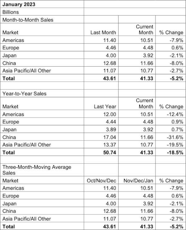 Selon les données de ventes de 3MMA de janvier, le marché chinois valait 11,66 milliards de dollars, en baisse de 31,6% par rapport à la même période un an plus tôt. Le marché de l’Asie-Pacifique, hors Chine et Japon, était évalué à 10,77 milliards de dollars, en baisse de 19,5 %. La région des Amériques a baissé de 12,4 % par an, l’Europe de 0,9 % et le Japon de 0,7 %. « Malgré des ventes record en 2022, le marché mondial des semi-conducteurs s’est considérablement refroidi au cours du second semestre, et cette tendance s’est poursuivie au cours du premier mois de 2023 », a déclaré John Neuffer, PDG de la SIA, dans un communiqué.