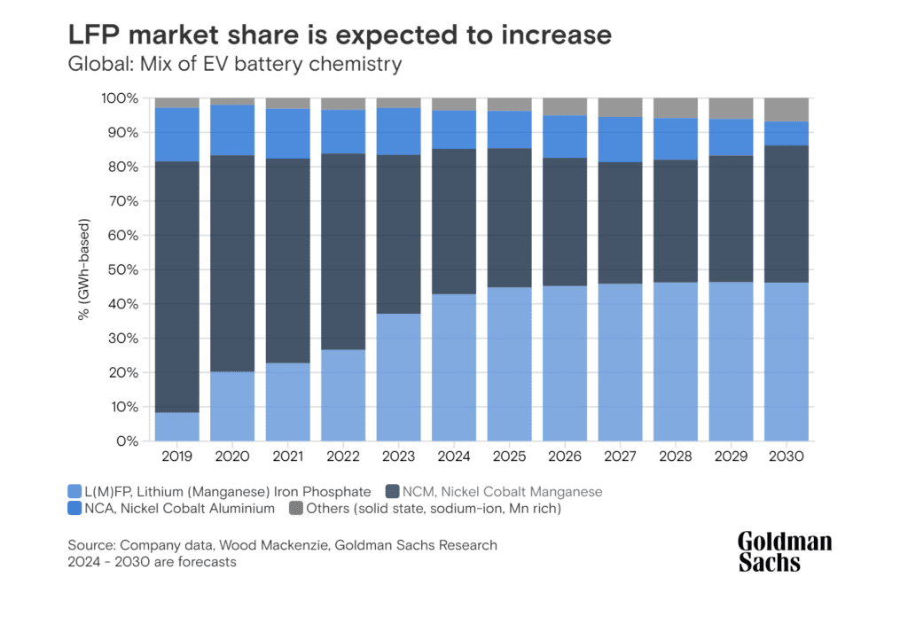 En conséquence, Goldman Sachs a revu à la hausse ses prévisions concernant les batteries LFP, qui devraient voir leur part de marché passer de 41 % à 45 % en 2025, les batteries au nickel avancé continuant à dominer la concurrence dans le domaine de l’énergie plus élevée.