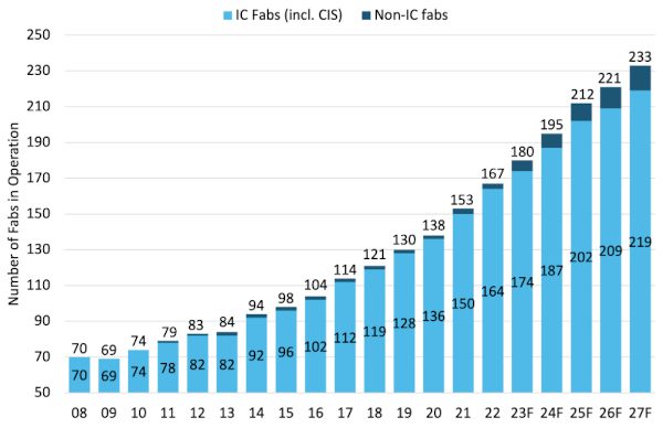 À la fin de l’année 2022, Knometa estime qu’il y avait 167 fabs utilisant des wafers de 300 mm de diamètre pour la fabrication de circuits intégrés, y compris les capteurs d’images CMOS, et de produits non liés aux circuits intégrés, tels que des composants de puissance discrets. Ce chiffre passera à 180 d’ici la fin de l’année 2023.