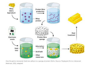 Des chercheurs de l’ETH Zurich ont récupéré le précieux métal à partir de déchets électroniques. Leur nouvelle méthode très durable est basée sur une éponge de fibrilles de protéines, que les scientifiques obtiennent à partir du lactosérum, un sous-produit de l’industrie alimentaire …